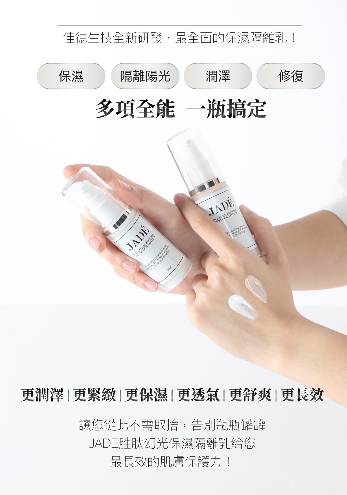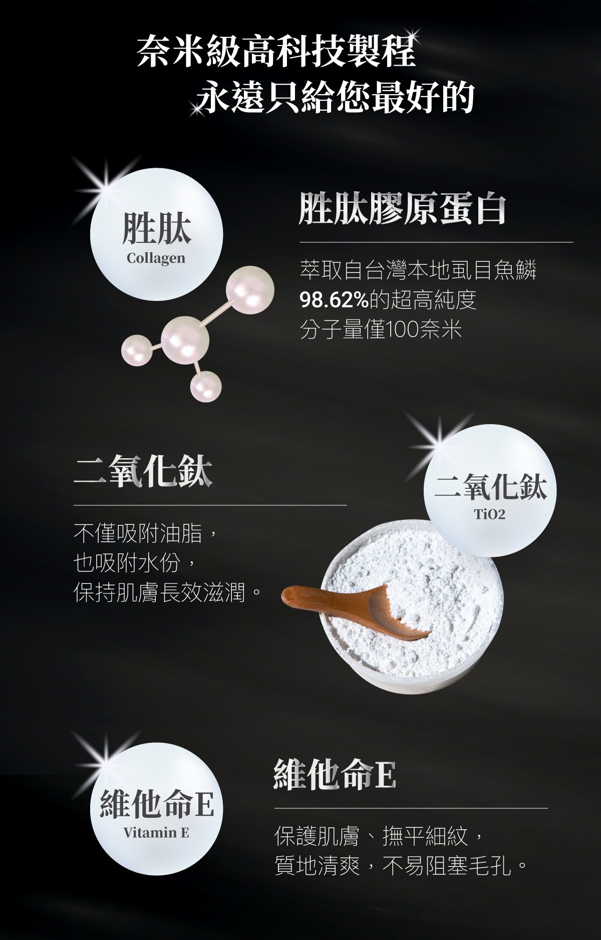 使用物理防曬成份-二氧化鈦(TiO2),有效降低紫外線對肌膚造成的傷害,且不易引起過敏反應,對肌膚更友善。 去除化學性防曬成份,為海洋環境盡一份力,同時清透質地讓您在活動時不黏膩。 奈米級膠原蛋白胜肽幫助肌膚快速吸收保養成份,讓妝感更服貼持久,肌膚水潤透亮一整天!