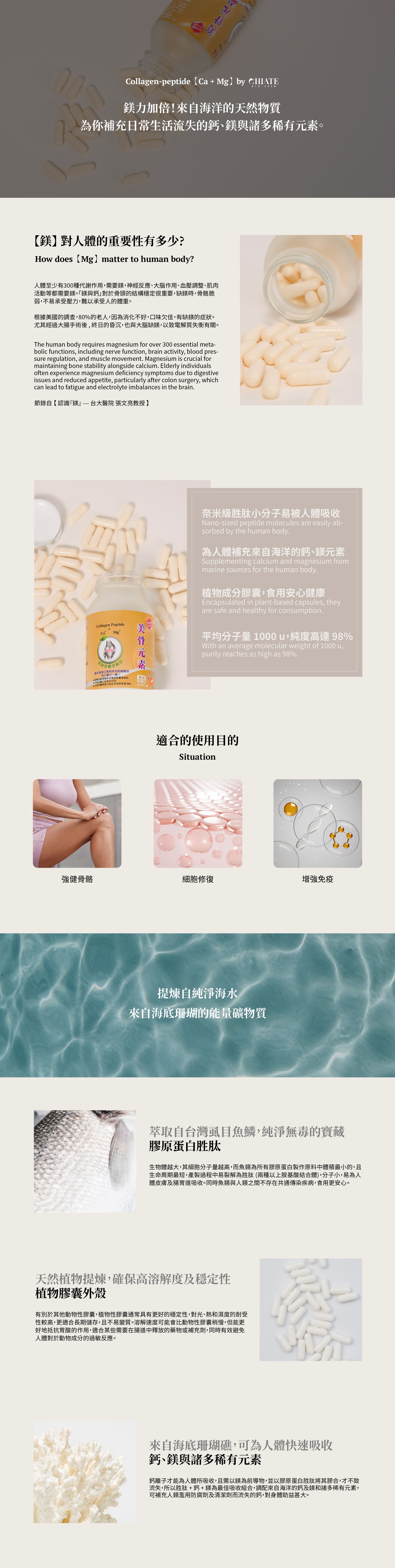 提煉自純淨海水級海底能量珊瑚鈣,可為人體快速吸收,內含純度高達98%的魚膠原蛋白胜肽,有效補充平時流失的鈣與鎂,強健骨骼機能。